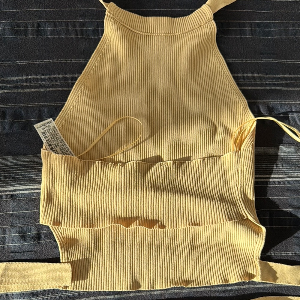 Elevate your style with this chic yellow ribbed halter top. Perfect for any occasion, this top offers both comfort and elegance.zara S