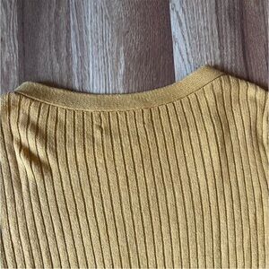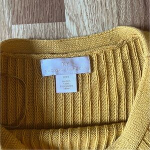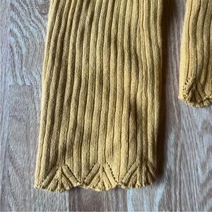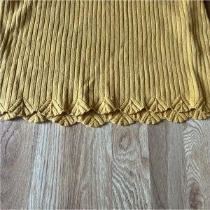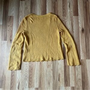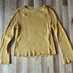 Bright yellow ribbed sweater. Features scalloped edges. Long sleeves and round neckline.