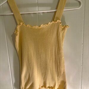 This is a yellow ribbed tank top from a website called Codibook which is a Korean website. Which is why the top is smaller than usual. People who are a size extra small to a size small will be fit best. This was tried on but never worn for a significant amount of time.