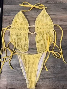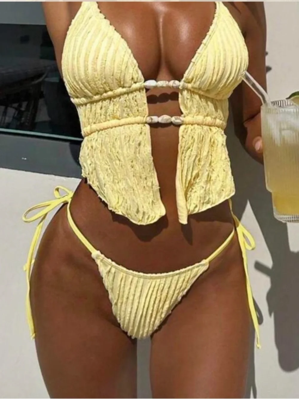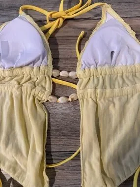 Textured ribbed fabric. Halter-style top with shell accents and front cutout. Tie-side bikini bottoms. Bright lemon yellow color. Beach-ready look.