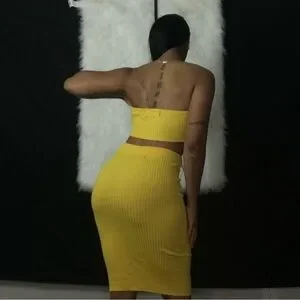 Stylish yellow ribbed two-piece set. Features a strapless top and matching skirt.