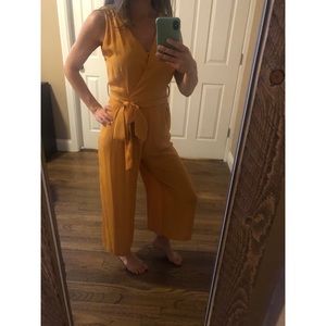 Flowy mustard yellow romper, side zipper and tie around waste. Button clasp in front, can unbutton for lower neckline.
