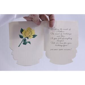 Celebrate Mom with the elegance of Yellow Roses in this vintage American Greetings Mother's Birthday card. More than a card, it's a craft project and a piece of memorabilia. The folding paper design and unique shape make it a standout. Show your love with this charming touch of nostalgia, perfect for creating lasting memories on her special day.