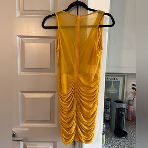 Shine in this yellow ruched dress, perfect for a cocktail hour or vacation! The vibrant color and flattering fit make it a must-have. Mesh back area, and a mesh section under the bust. Size L, only worn once.