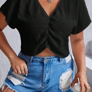 Elevate your style with this chic black ruched V-neck top. Perfect for any occasion, this top offers a flattering fit and timeless elegance.