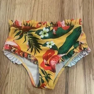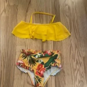 Bright yellow bikini set with ruffle top and floral bottoms. Perfect for a sunny day at the beach. Cute ruffle detail on bottom. Removable strap for bandeau style top. Purchased from online children’s boutique! New, excellent condition!