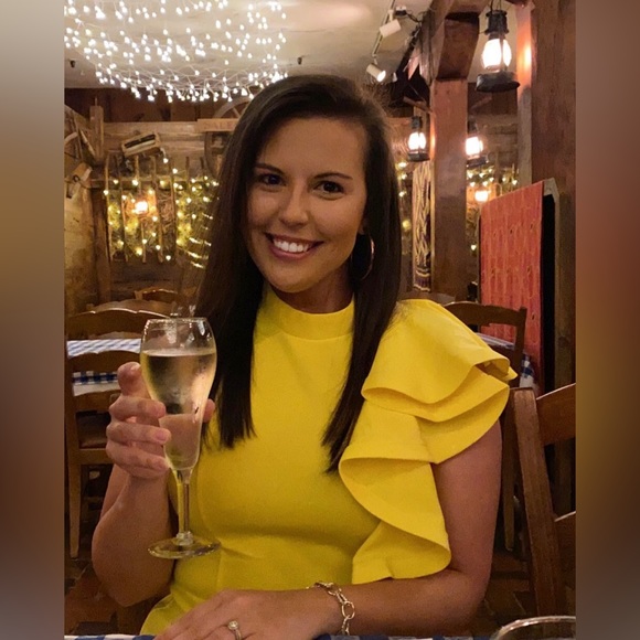 yellow ruffle sleeve dress, worn once. size L from shop these three. smoke and pet free home