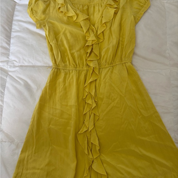 Brighten your wardrobe with this elegant yellow 100% silk ruffle dress. Perfect for any occasion, this dress offers a flattering fit and stylish design.