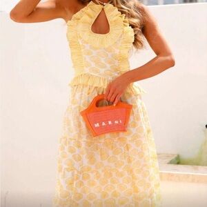 Sunshine yellow halter dress with ruffled neckline and keyhole detail. All-over shell print. Flowy A-line skirt. Bright summer-ready color.