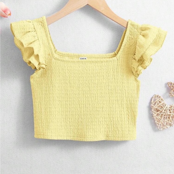 Elevate your style with this vibrant yellow blouse from, featuring charming flutter sleeves and a smocked design. The cropped length and ruffled details add a playful touch, making it a perfect choice for sunny days. Crafted for comfort and style, this top is a must-have addition to your wardrobe.