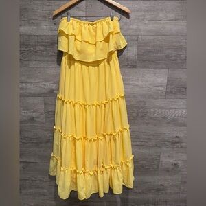 Bright yellow strapless dress with playful ruffles. Ideal for summer outings. Comfortable and chic. With Pockets!