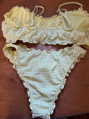 Light yellow two-piece bikini with ruffle trim. Textured check pattern across fabric. Adjustable shoulder straps and soft cups. Playful and feminine swimwear piece. There are no tags so if you want measurements, lmk!