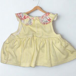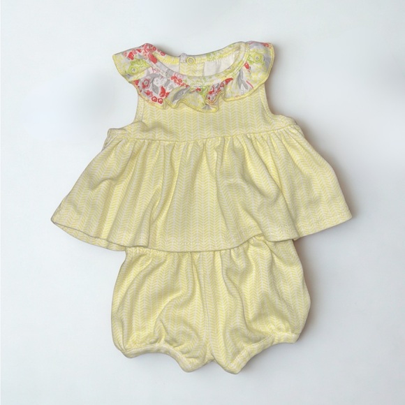 Adorable yellow baby romper with ruffled details and flowered collar. 2 snap closure on the back of the shirt. Shirt is separate from the bloomers. Perfect for a sunny day out.