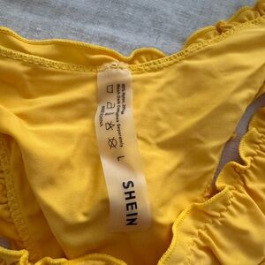 Bright yellow bikini with ruffled details. Bandeau top with tie closure. Matching bottoms with a flattering fit.