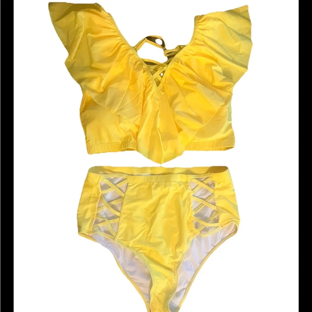 Bright yellow bikini set with ruffled top and high-waisted bottoms. Features crisscross details. NWOT