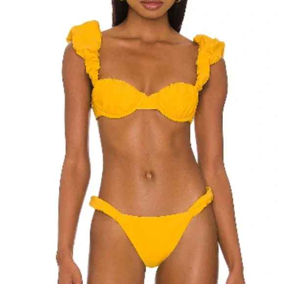 Stand out with this vibrant yellow bikini from LPA. Worn once, and sold out. Features playful ruffles for a chic look. Ideal for sunny beach days.