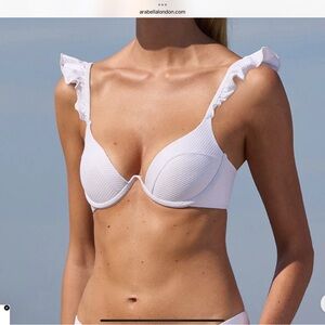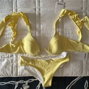 Both top and bottom are size small. New with tags, hygienic liner is on bottoms. Added pics from designer website so you can see the fit of the top and bottom, but bikini is yellow, not white.