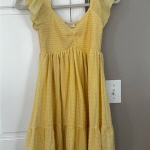 Charming yellow kids dress with ruffled sleeves. Perfect for any occasion.