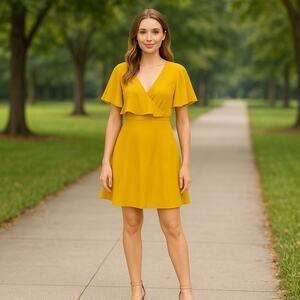 Yellow ruffle top dress with flutter sleeves. Hidden back zip with hook and eye closure. Please use measurements to determine the best size to order.