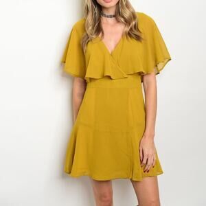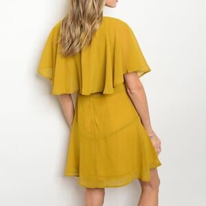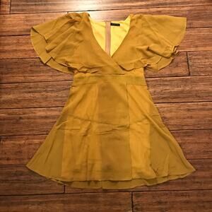 Yellow ruffle top dress with flutter sleeves. Hidden back zip with hook and eye closure. Please use measurements to determine the best size to order.