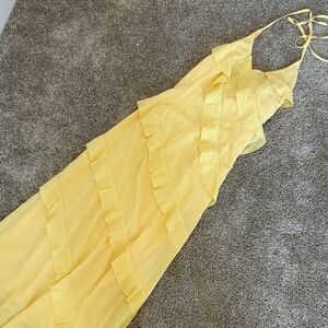 Elegant yellow halter dress with ruffle details. Perfect for summer occasions.