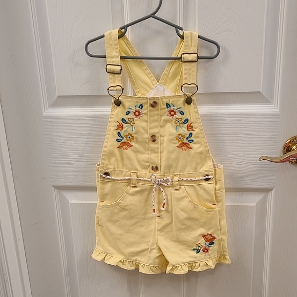These vibrant yellow overalls feature a high-waisted design with charming ruffle details, perfect for adding a playful touch to your wardrobe. Crafted from a lightweight fabric, they offer a relaxed fit ideal for warm weather adventures.