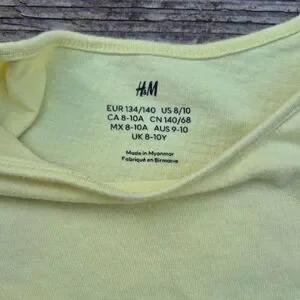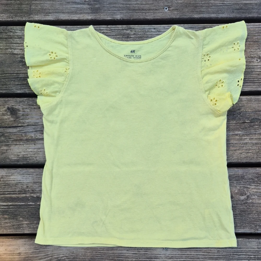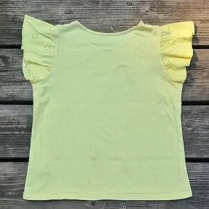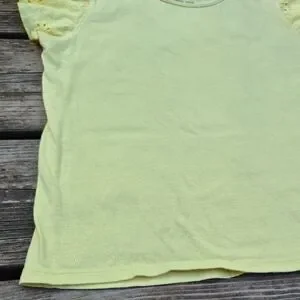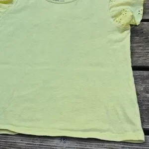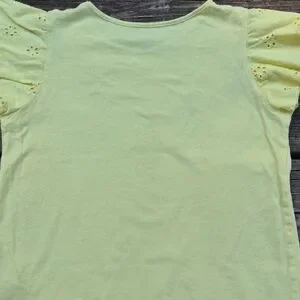 Charming light yellow tee with eyelet ruffle sleeves. Soft and stylish for everyday wear.