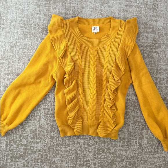 Brighten your wardrobe with this stylish mustard yellow ruffled sweater. Perfect for adding a pop of color to any outfit.