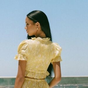 Chic yellow two-piece set with ruffled details. Perfect for summer outings.