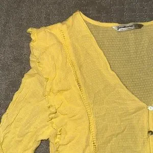 Brighten your wardrobe with this stylish yellow ruffled top. Featuring a flattering V-neck and button-up design, it's perfect for any occasion.