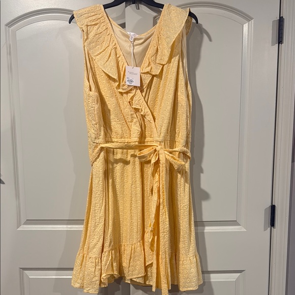Charming yellow wrap dress with ruffled details. Perfect for a sunny day.