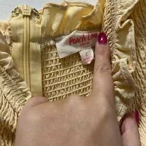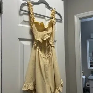 Light yellow romper with smocked bodice. Features ruffled details. Ideal for warm weather.