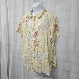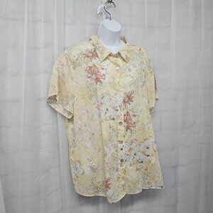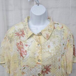Yellow Salmon Floral Blouse Swiss Dot Boho Cottagecore 1X+