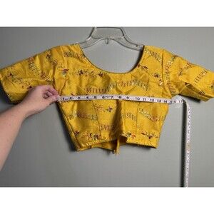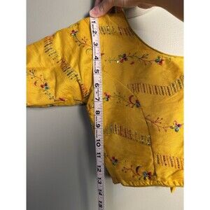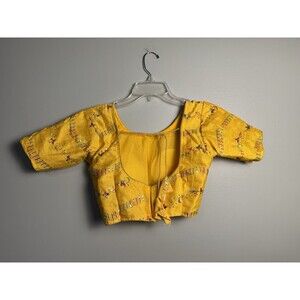 This product is a stylish yellow saree blouse with a round neck, floral print, and unique round back drop design, making it a perfect choice for women. The choli style of the blouse adds a modern touch to the traditional attire, making it a fashionable option for any occasion.