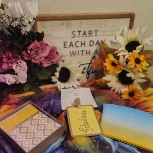 Bright yellow keychain with 'Fabulous' text. Blue ombre pouch included.(ipsy) and yellow blank stationery cards super cheerful and fun! comes with a cute gift bag from Scentsy!