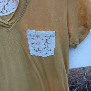 Brighten your wardrobe with this vibrant yellow short sleeve tee. Featuring a stylish lace pocket, this top is perfect for casual outings. Enjoy comfort and style in one piece.