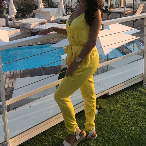 -yellow silk jumpsuit with wrap around tie and pockets on each side