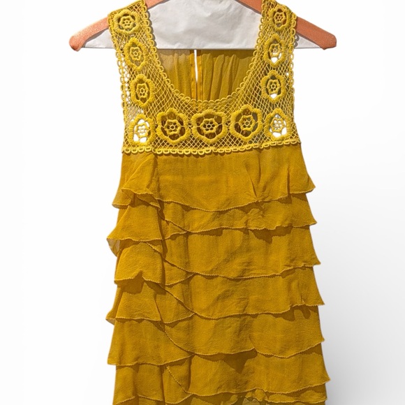 Chic sleeveless dress with ruffle layers. Features intricate crochet detailing at the neckline. Vibrant yellow color.