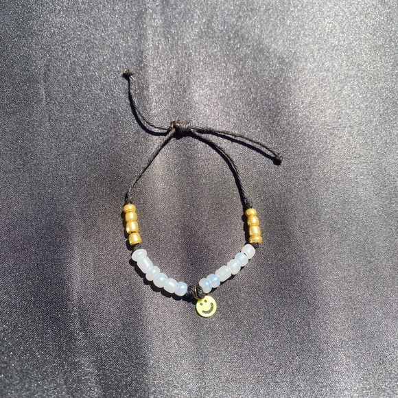 Drawstring bracelet. With plastic beads (may be a little bit small)