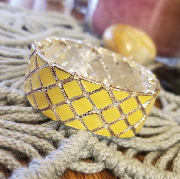 Yellow Diamond Shape Pattern with Silver Inlay. Elastic Wrist.