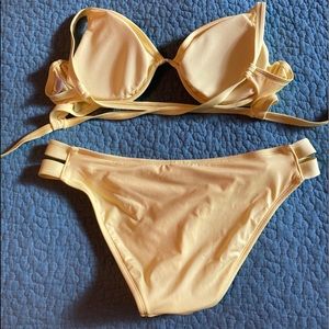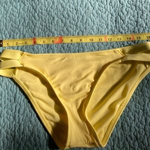 Two piece yellow bikini fits sizes 8-10. Top has underwire and slight, removable padding. Tie string makes for assured fit and comfort. UGC. See photo for measurements.