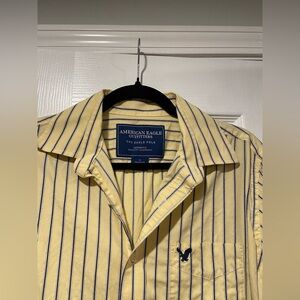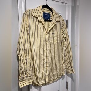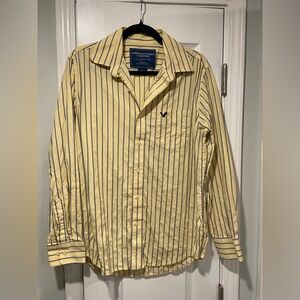 Stylish yellow shirt with black stripes. Button-down design. Perfect for casual wear.