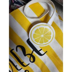 Keywords: tote bag, yellow tote, striped tote, canvas tote, beach bag, summer bag, novelty tote, Squeeze The Day, magnetic closure, lemon bag, yellow striped bag, vacation tote, shopping bag, gift idea