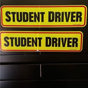 Set of three yellow Student Driver signs with bold black text. Perfect for new drivers.