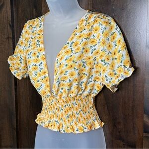 Yellow Sunflower Print white Crop Top deep v neck Size S smocked waist summer