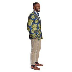 Elevate your style with the Tazio Textured Jacket, a striking blend of classic tailoring and modern flair. In a captivating Blue with Large Yellow Flowers, this Single Breasted jacket features a sleek 1-Button Closure, Modern Fit, and Peak Lapel for a refined silhouette. Boasting functional details such as 2-Flap Front Pockets, 1-Chest Pocket, and Three Interior Pockets, it seamlessly combines style and practicality. The underarm Sweat Guards ensure comfort, while the distinctive pattern sets you apart. This standalone piece allows for versatile styling, making it perfect for both formal and casual occasions. With Interior French Facing and the absence of a Bow or Tie, the Tazio Textured Jacket is a statement of individuality, where tradition meets contemporary design.