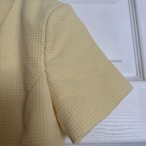 Chic yellow textured short sleeve blazer. Features elegant crystal buttons for a touch of sparkle.