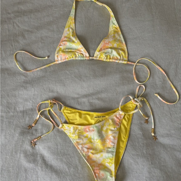 Two-piece string bikini with tropical floral print and beaded ties. Triangle halter top and tie-side bottoms. Bright yellow with soft peach and mint accents. Only worn once! Medium top and bottom!