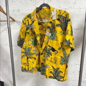 Vibrant yellow shirt with a tropical print. Features palm trees and animals.