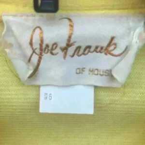 Joe Frank of Houston jacket!!! Straight from the 60/70s era! Almost flawless…a tiny spot on the back right sleeve and front right pocket. Gorgeous yellow! Measures 25” from top to bottom, 17” from pit to pit, and 16” from under pit to edge of sleeve.